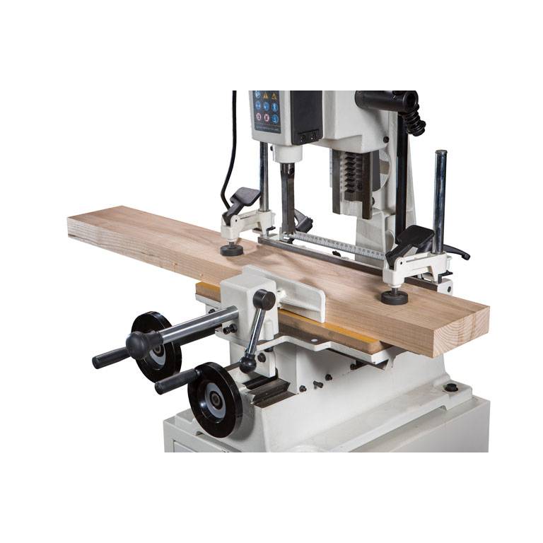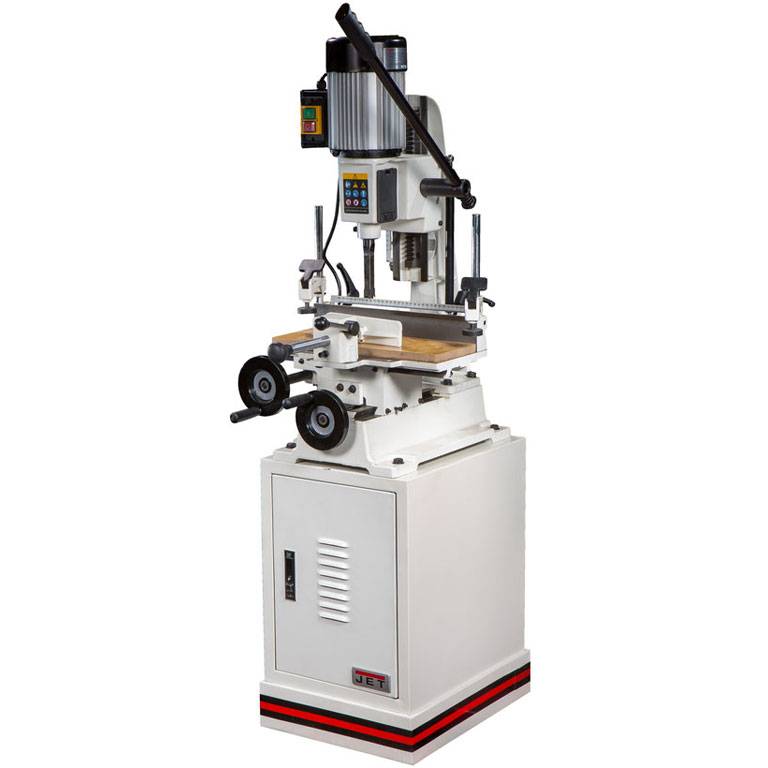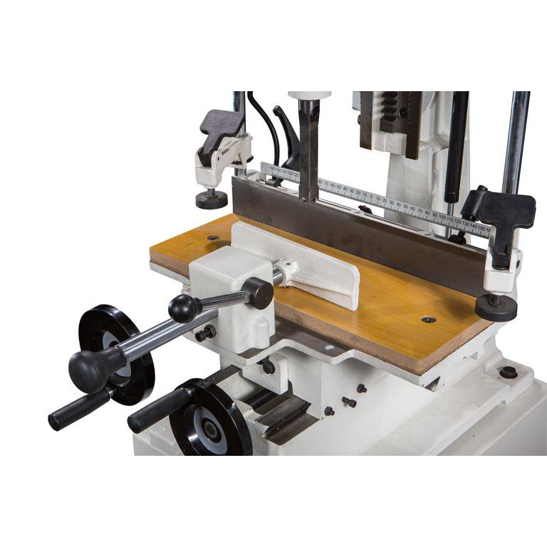 JFM-6 хорошо оснащенный, удобный и точный в работе долбежно-пазовальный станок для любительского применения. Основание, колонна, рабочий стол, упоры и прижимы заготовки выполнены из массивных чугунных отливок, что обеспечивает высокую точность и отсутствие вибраций при работе. В комплект поставки входит металлическая тумба-основание с отсеком для хранения инструментов.