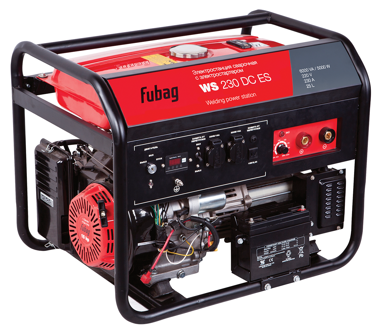 Высокая мощность и длительная работа без дозаправки Мощная сварочная станция с профессиональным OHV двигателем FUBAG оснащенная электростартером. Лучший выбор для мобильных ремонтных бригад в условиях недоступности стационарной электросети. Оборудована вместительным 25-литровым топливным баком рассчитанным на девять часов непрерывной работы. Надежность и отличные эксплуатационные характеристики Запуск двигателя осуществляется как электростартером, источником энергии для которого служит бортовой аккумулятор, так и вручную. Станция оснащена встроенной защитой от перегрузки и системой аварийного отключения двигателя при низком уровне масла в картере. Усиленная рама повышает надёжность конструкции, что даёт возможность эксплуатировать станцию в сложных условиях стройплощадки. Уверенная сварка в диапазоне сварочного тока от 50 до 230 А Постоянный ток гарантирует высокую стабильность параметров дуги и отличное качество шва. Диапазон сварочного тока – от 50 до 230 А, это даёт возможность уверенно работать электродами разного типа диаметром от 1,6 до 5,0 мм. Для подсоединения силовых кабелей станция оборудована «быстрыми» байонетными разъёмами. Источник энергии Как источник энергии отлично подходит для используемого при строительстве электроинструмента, рассчитанного на работу в сети 220 В. Для подключения потребителей станция оснащена двумя розетками на 220 В /16 А