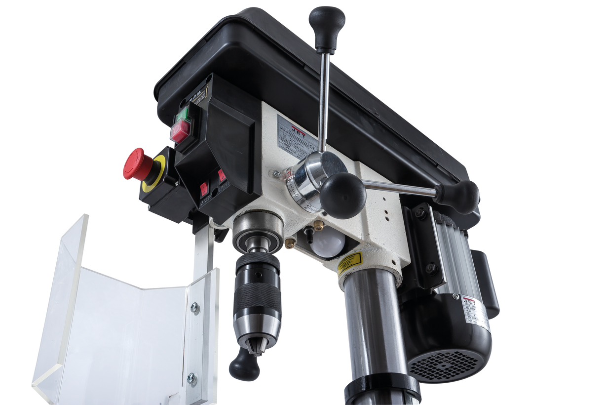 JWDP-12 — настольный сверлильный станок профессионального класса, подходящий для универсального (дерево и металл) применения. Основная отличительная черта этой модели – клиноременный вариатор, позволяющий плавно бесступенчато изменять скорость вращения шпинделя. Такая конструкция механизма ускоряет настройку в зависимости от диаметра сверления: вместо снятия и последующей установки ремня достаточно перевести рычаг, причем делают это, не выключая мотор. При этом фактическая скорость вращения шпинделя будет отображаться на цифровом дисплее, что особенно важно при работе с металлом, когда ограничения по частоте вращения режущего инструмента гораздо более строгие, чем при работе с деревом.