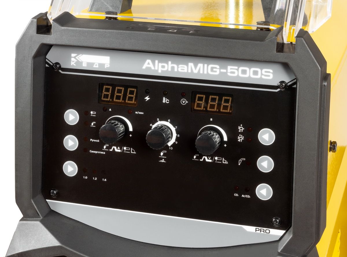 КЕДР AlphaMIG-500S оснащен интеллектуальной моделью управления, позволяющей сварщику в кратчайшие сроки подготавливать оборудование к работе и переходить от процесса к процессу. Помимо этого, аппарат позволяет осуществлять ручную подстройку в синергетическом режиме, адаптируя сварочные характеристики под конкретный материал и условия работы.